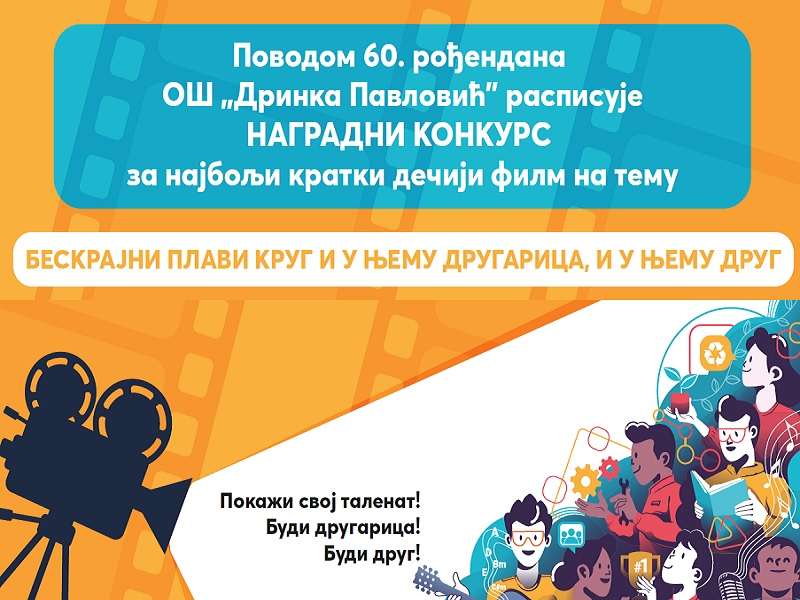 Поводом 60. рођендана ОШ „Дринка Павловић“ расписује НАГРАДНИ КОНКУРС за најбољи кратки дечији филм на тему Бескрајни плави круг и у њему другарица, и у њему друг. Услови конкурса: [...]