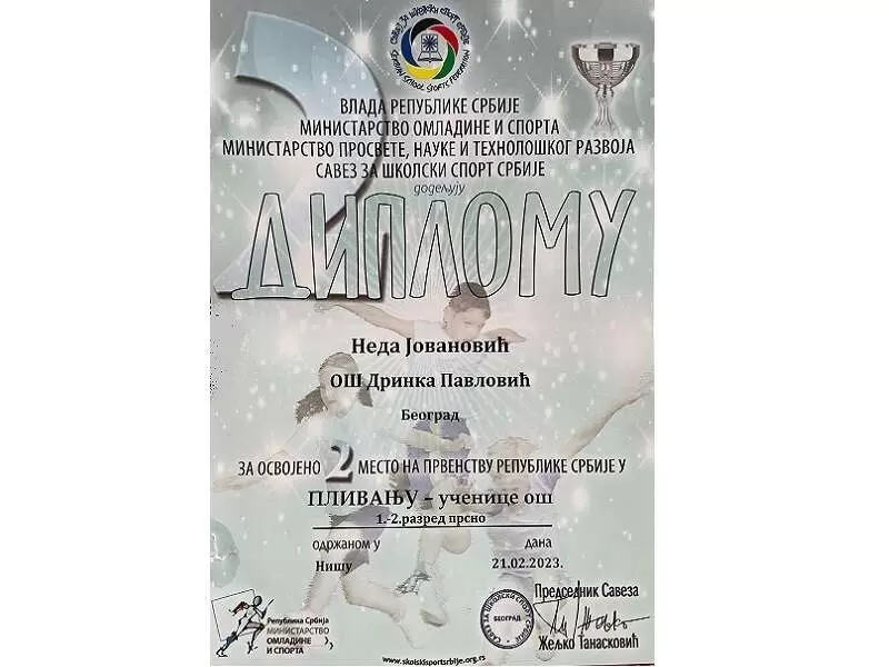 Јако смо поносни на нашу ученицу II разреда, Неду Јовановић, која је на републичком такмичењу у пливању у категорији 50m прсно, које је прошле недеље одржано у Нишу, освојила 2. место представљајући нашу школу.