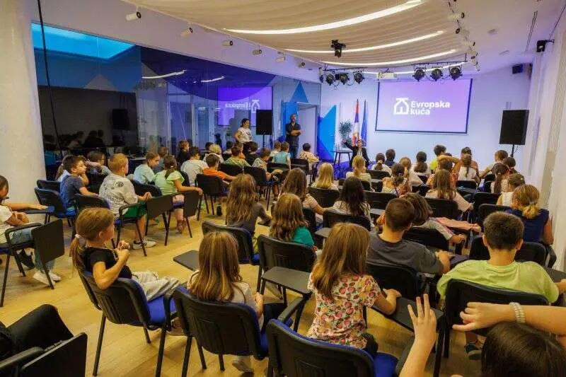 Ученици 3/1 и 3/3 са учитељима Нелом Гајић и Иваном Пауновићем посетили су Европску кућу Београд, 22.9.2025. године.