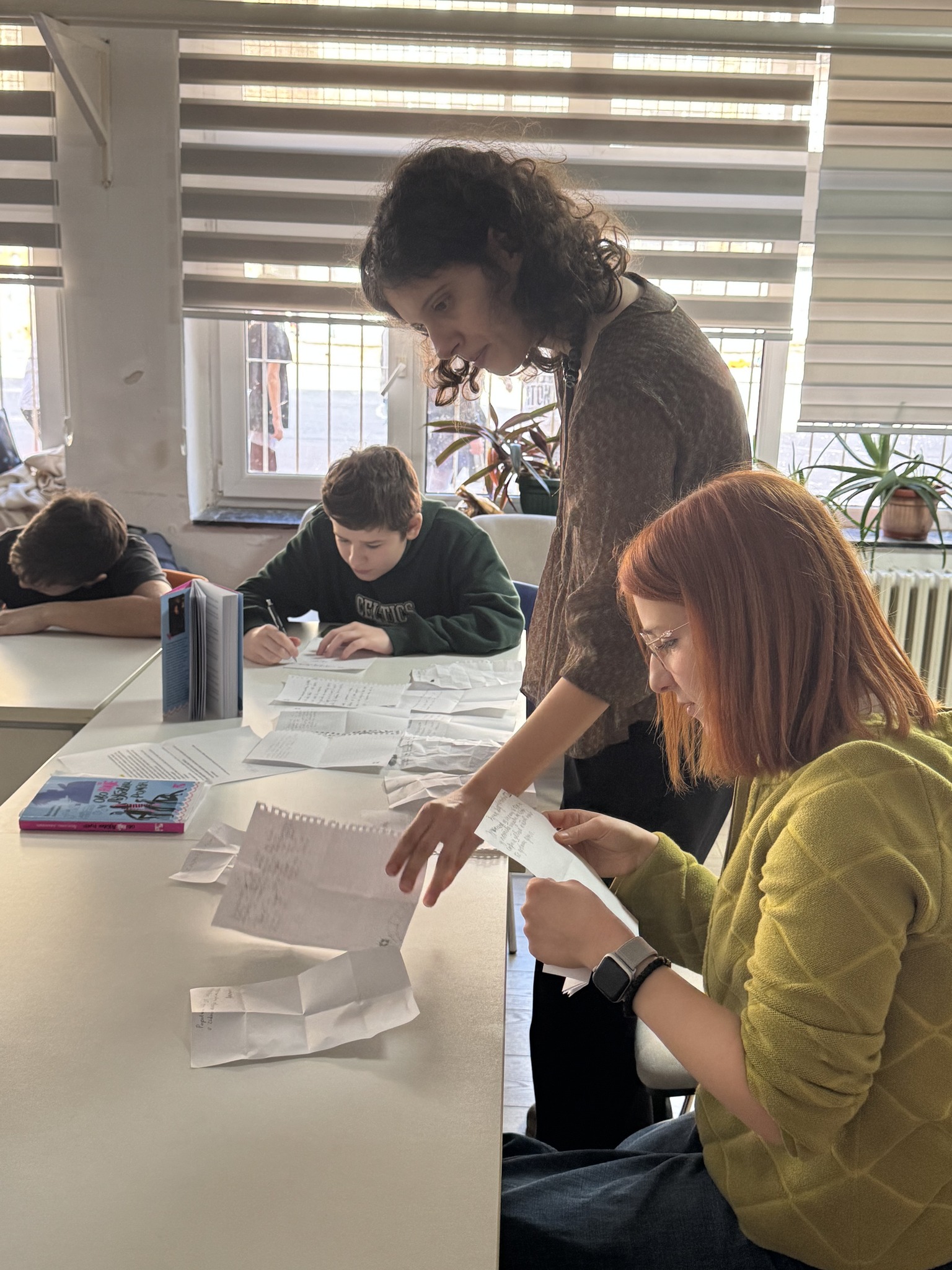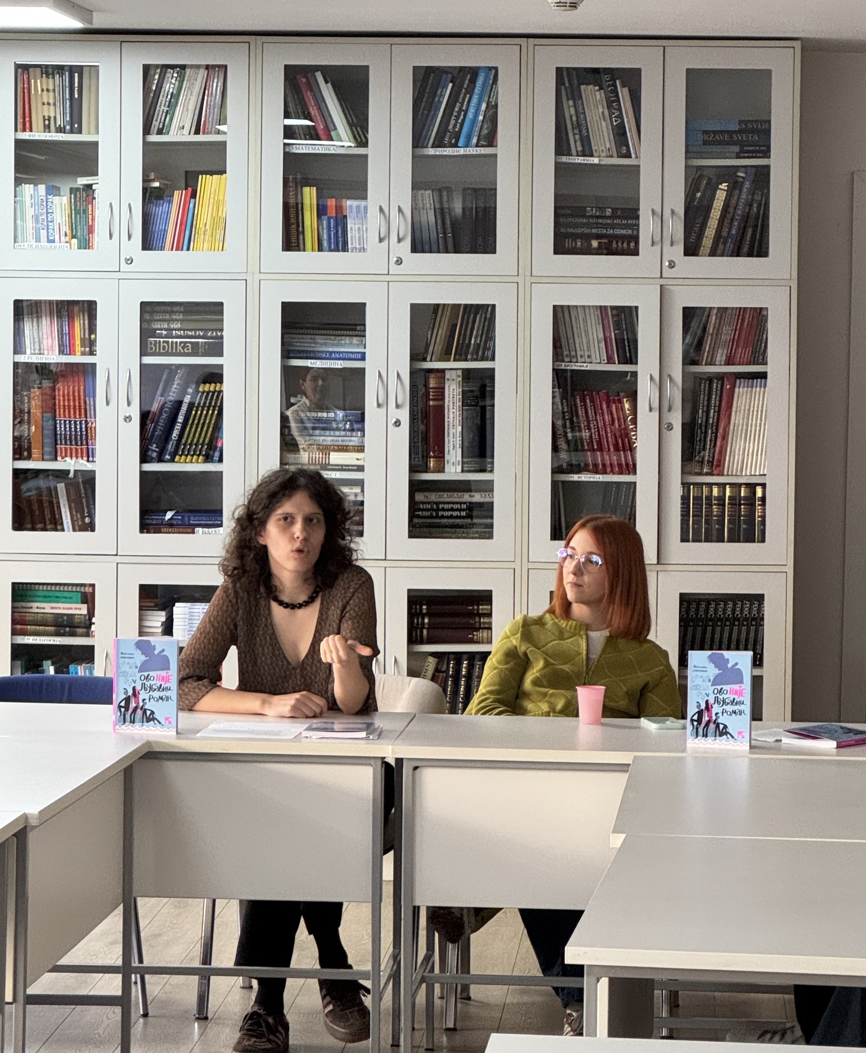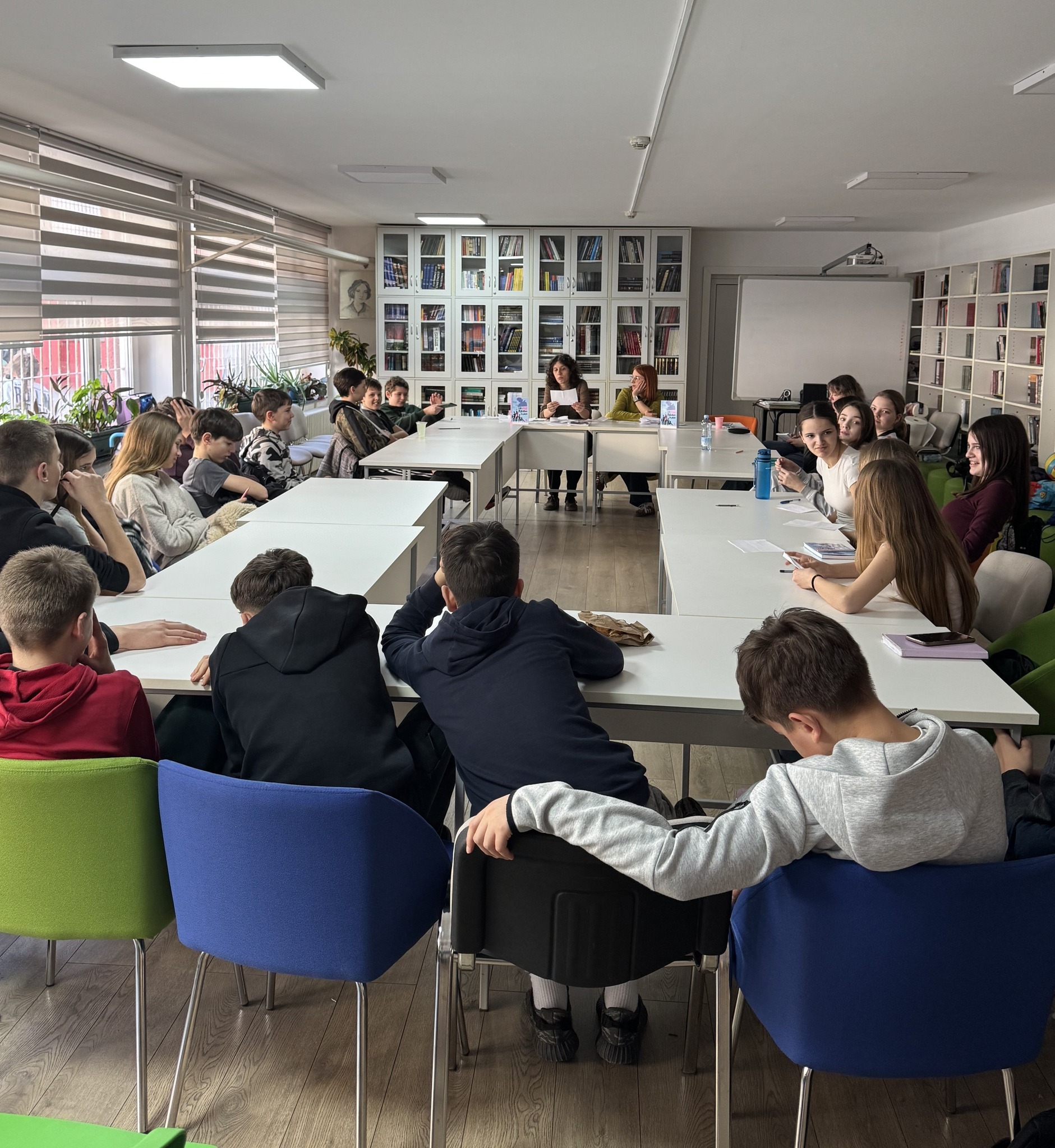 Промоција књиге Александре Јовановић “Ово није љубавни роман” одржана је 6. 3. 2026. године у школској библиотеци. Ученици 7/4 и наставница Тамара Панић Милошевић разговарали су ауторком и гостима из Издавачке куће „Креативни центар“.