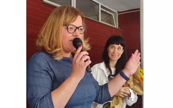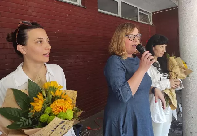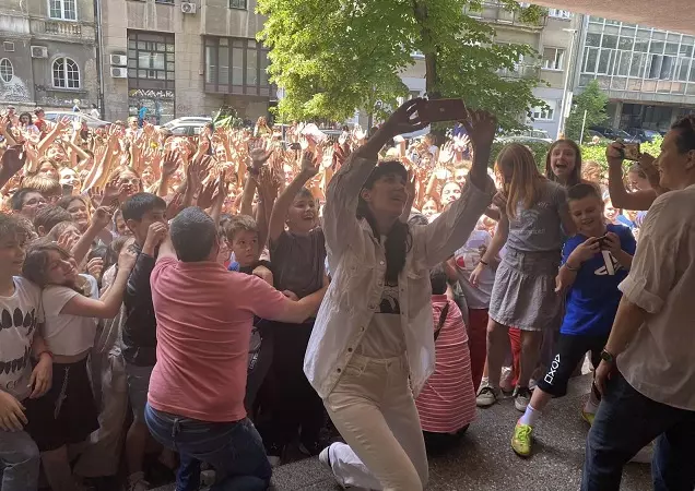 Констракта је са ученицима направила одличну атмосферу који су се окупили испред школе да певају заједно са њом.